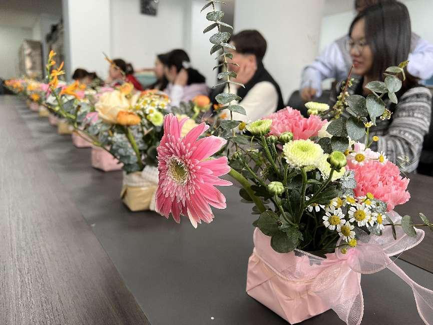 活动现场,花香四溢,各类鲜花色彩斑斓、争奇斗艳。一束束造型别致的鲜花作品呈现在眼前,在欢声笑语中领略了艺术的无限魅力。此次活动不仅让大家感受到组织的温暖与关怀,也释放了工作中的压力,引导女教工做“有魅力、有感染力、有幸福力”的新女性。大家纷纷表示,要以此次活动为动力,充分发挥巾帼精神,立足岗位、奋力拼搏,为学院各项工作高质量发展贡献自己的力量。