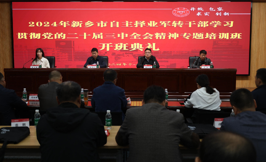 为深入学习贯彻习近平新时代中国特色社会主义思想和党的二十届三中全会精神,强化退役军人思想政治引领,11月4日上午,2024年新乡市自主择业军转干部学习贯彻党的二十届三中全会精神专题培训班在我校开班。新乡市退役军人事务局副局长赵虎山、自主择业军队转业干部服务中心主任郭强、williamhill中文院长田大治、副院长田贝贝出席开班典礼,33名自主择业军转干部参加培训。