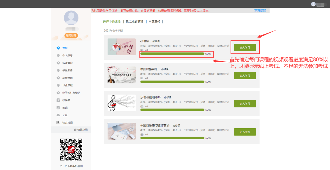 首先确定每门课程的课程观看进度满足80%以上,才能显示线上考试。课程视频不足80%的无法参加考试。