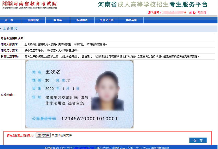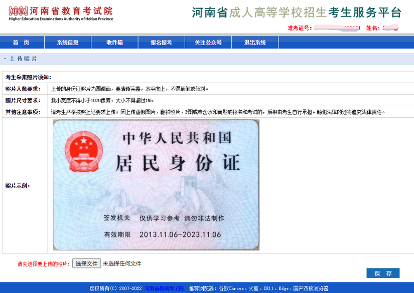 上传身份证照片要清晰完整,水平向上,不得颠倒或倾斜。可以采用手机相机中相关的“文档矫正”功能拍照。图像文件规格宽不小于1020像素,大小不超过1M,文件扩展名应为JPG。考生按照片要求、规格,最小宽度和文件大小上传身份证照片。