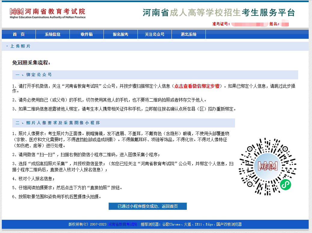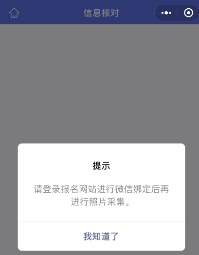 考生如果未关注公众号并绑定个人信息,则需要点击“查看微信绑定步骤”链接,进行关注绑定操作,否则直接使用微信扫码获取考生信息。绑定成功后,微信扫描左侧二维码,进入图像采集小程序。