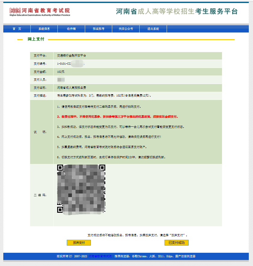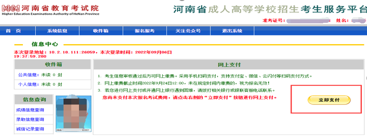 考生信息通过审核后,在网上支付栏中出现支付按钮,点击“立即支付”按钮进行网上支付。