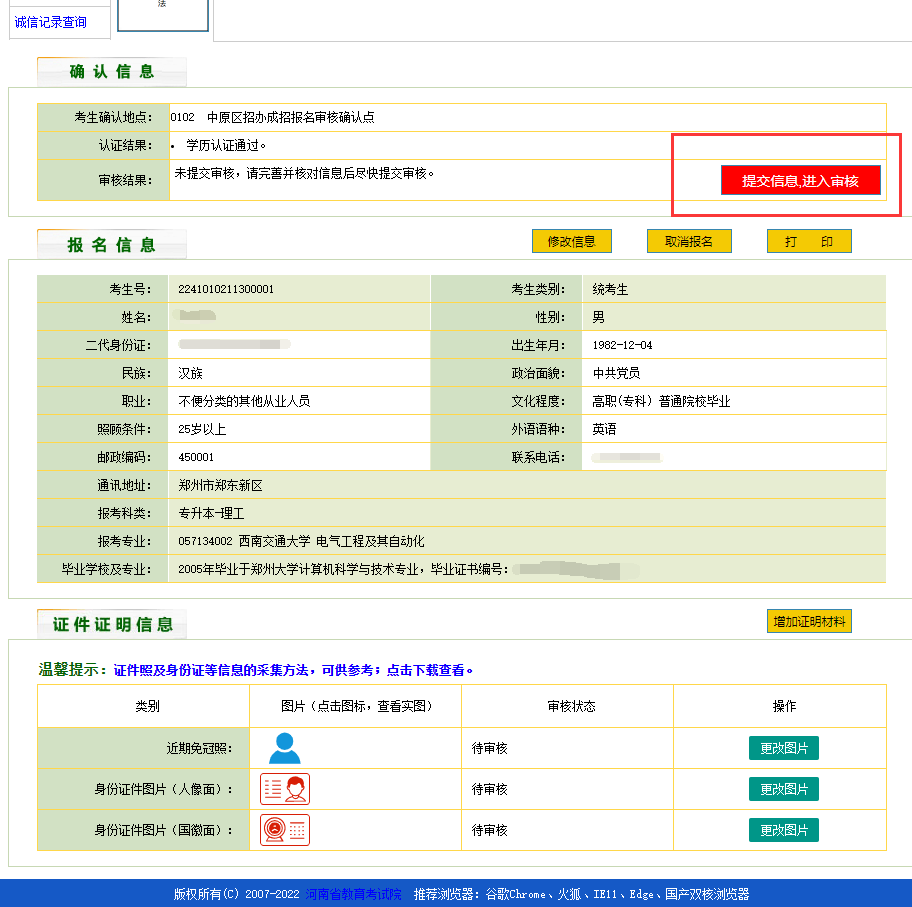 考生完成信息填报和材料的上传,点击“提交信息,进入审核”按钮。