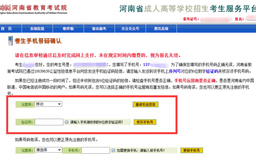 2.手机号归属地必须是河南省,携号转网的考生需要选择对应的运营商