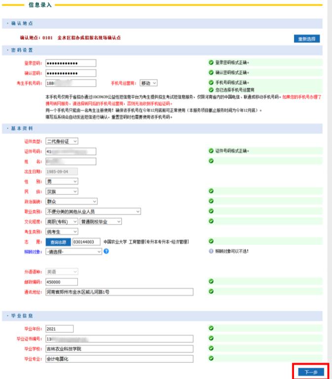 考生需按照系统的提示和要求,填写个人信息,选择报考层次、学校、科类、专业等信息后点击“下一步”按钮即可。