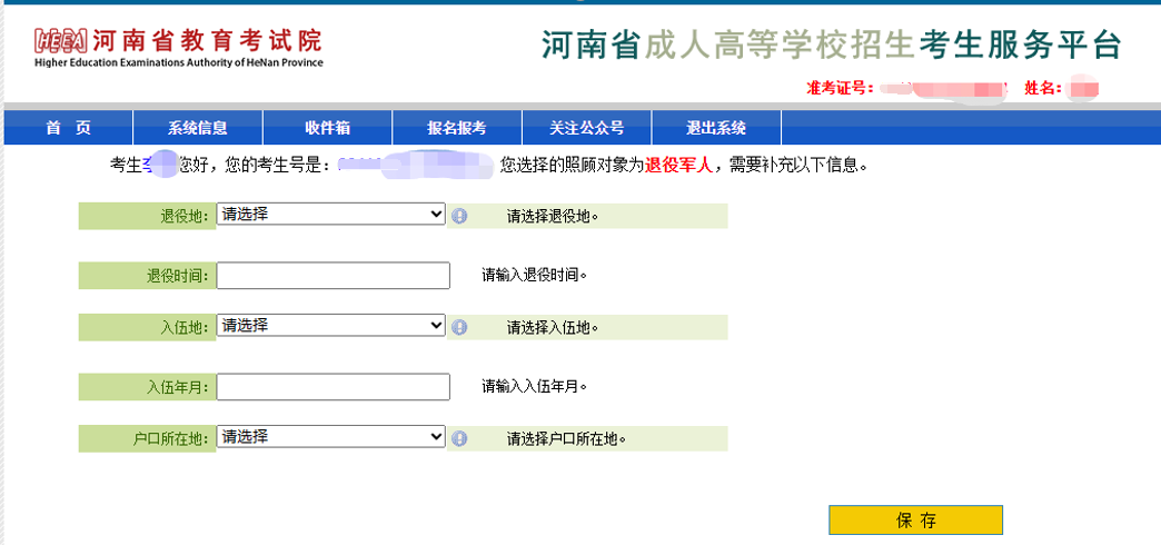 退役军人需要补充信息,选择退役地、退役时间、入伍地、入伍年月和户口所在地。