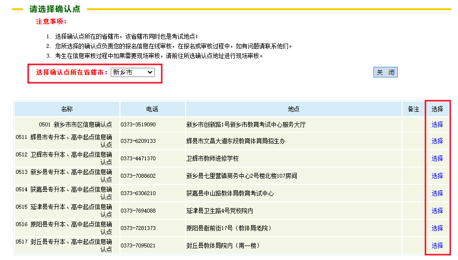 (1)选择信息审核确认点所在省辖市,查看确认点信息和相关备注后,点击选择确认点右侧的“选择”,最后点击确定。