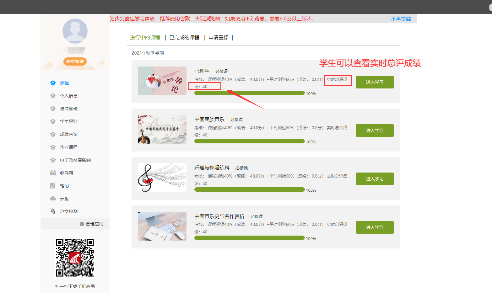 网络课程最终成绩生成为百分制,其中网络课程视频观看进度占40%,网上考试占60%,最终总评成绩合成60分以下为不合格。每学期成绩合格课程将在“已完成的课程”中显示。