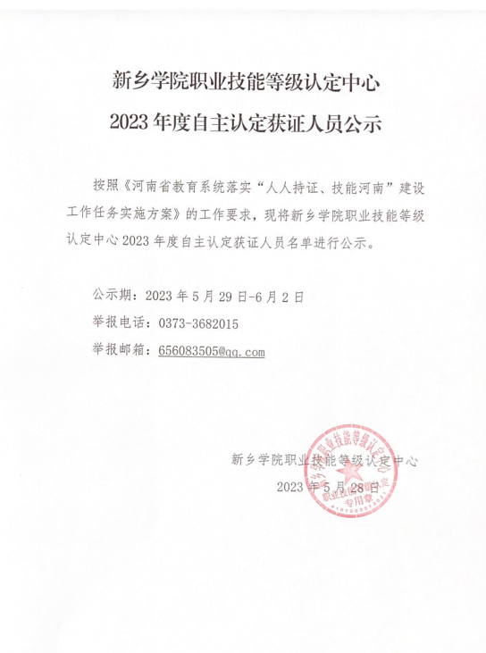 威廉官网中国职业技能等级认定中心2023年度自主认定获证人员公示
