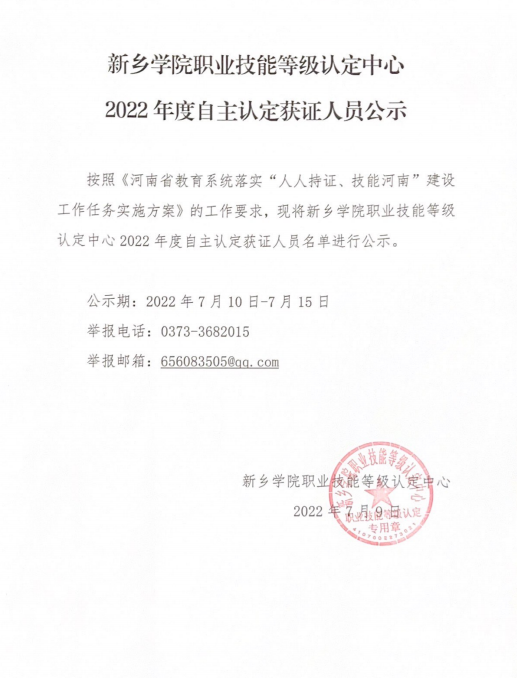 威廉官网中国职业技能等级认定中心2022 年度自主认定获证人员公示
